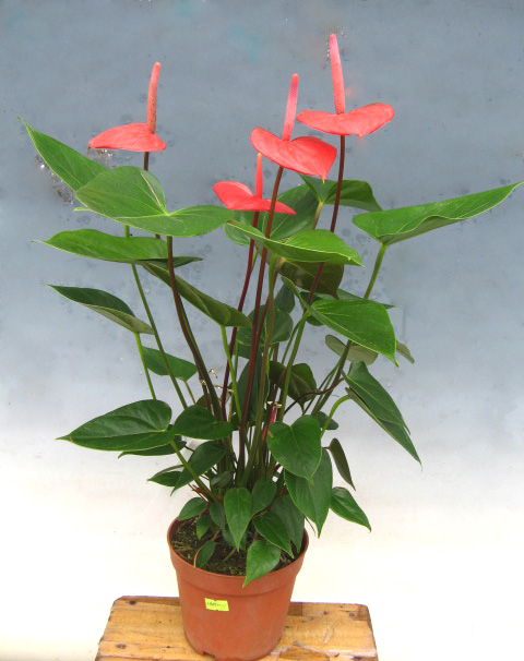 “阳光红心”红掌植株中小型,株型紧凑,花红色,呈三角状,花型平展,高出叶面5-10cm,红色肉穗花序,花梗紫红;易分蘖,丛生性好,抗病性强,可用于盆花观赏,水培观赏,室内绿化等。